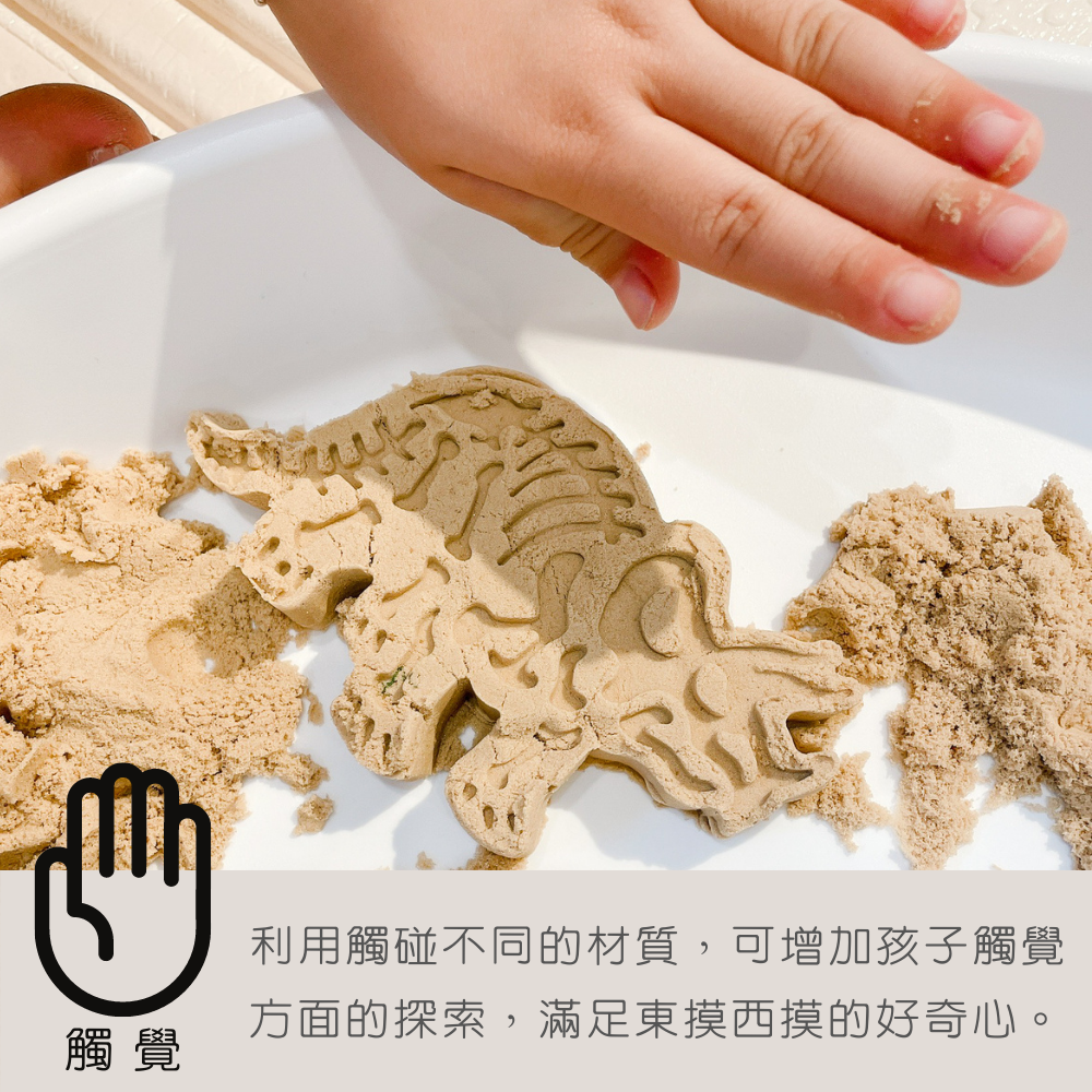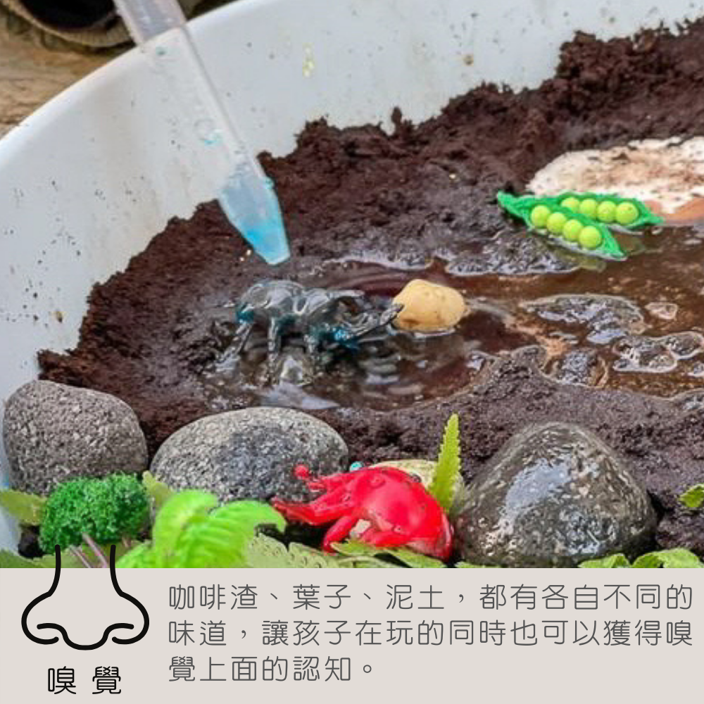 感官玩玩盆是完全貫徹「開放式玩法」,在盆子中放入各種不同材質的素材、或是搭配繪本帶入更多相關的元素或觀點,完全展現學中玩的理念,孩子可以用手抓揉拍打、用腳盡情踩踏...讓孩子在盡情「玩」的過程,可以刺激視覺、聽覺、觸覺、嗅覺、味覺,五感發展愈完整,看待這世界的觀點也就愈多元,大腦發展和認知的建構也就愈成熟。