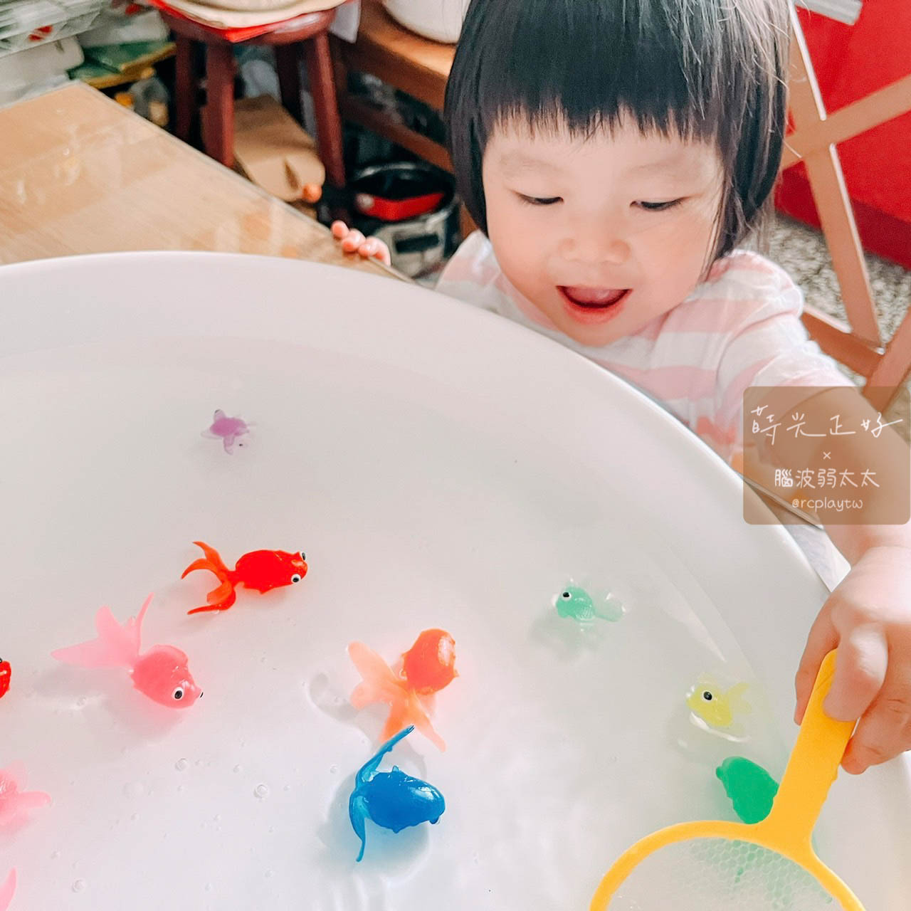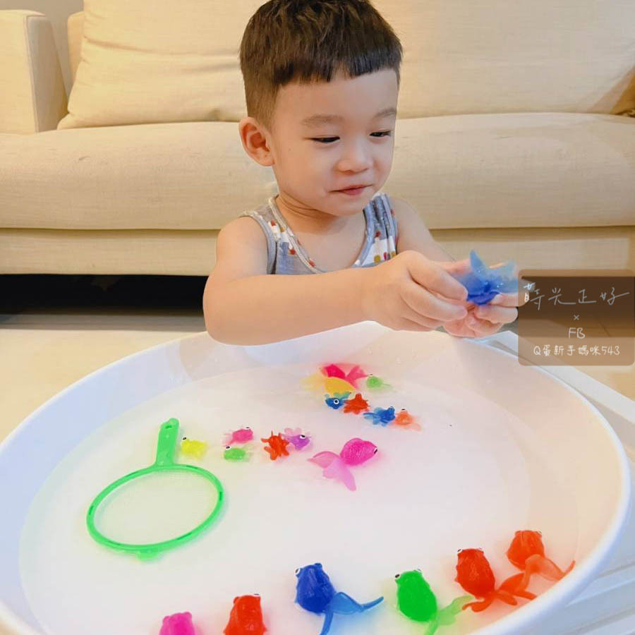 在玩玩盆裡加點水,就可以開始撈金魚。