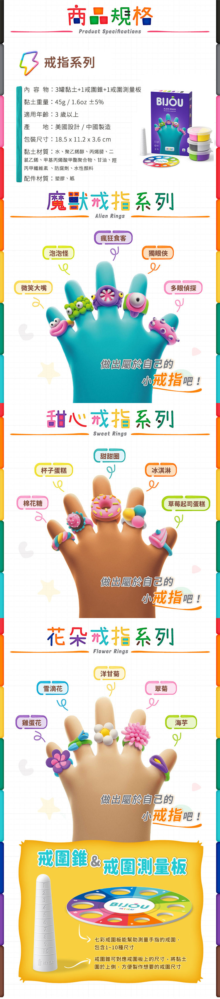 ● 內容物:3罐黏土+1戒圍錐+1戒圍測量板